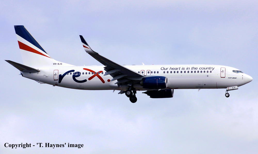 This aircraft was ordered new by Silkair, Singapore - ? Rolled off the Boeing production line at Seattle (Renton) - February 2014 Powered by CFMI CFM56-7B27E engines Entered onto the Singapore Aircraft Register as 9V-MGB - February 22, 2014 First flown at Seattle (Renton) - February 22, 2014 Accepted by Silkair at Seattle (Boeing Field) - March 07, 2014 Silkair ceased all operations - March 20, 2020 The aircraft was withdrawn from use and stored at Singapore (Changi) It was repainted into the standard 'Singapore Airlines' livery - ?, 2021 It was transferred to Singapore Airlines - March 11, 2021 The aircraft was withdrawn from service and stored at Singapore (Changi) - May 21, 2022 Test flown Singapore (Changi) - Singapore (Changi) - September 13, 2023 Sold to Fuyo Aviation Australia Ltd, Dublin, Ireland - September ?, 2023 Cancelled from the Singapore Aircraft Register - September 20, 2023 Entered onto the Australian Aircraft Register as VH-8JS - September 20, 2023 Registered to Fuyo Aviation Australia Ltd, Dublin, Ireland Leased to Regional Express Pty Ltd, Sydney as the registered operator Departed Singapore (Changi - 12:24 local) on the delivery flight to Australia - September 22, 2023 It arrived at Brisbane (22:02 AEST) on completion of the delivery flight from Singapore - September 22, 2023 Delivery route: Singapore - Darwin - Brisbane Operated its first revenue service Brisbane - Sydney (Kingsford Smith) as ZL367 - October 10, 2023 REX Regional Express entered voluntary administration due to financial difficulties - July 30, 2024 Operated its final service Melbourne (Tullamarine) - Sydney (Kingsford Smith) as ZL182 - July 30, 2024 It was withdrawn from use and stored at Sydney (Kingsford Smith) pending return to the lessor Current status - ? |