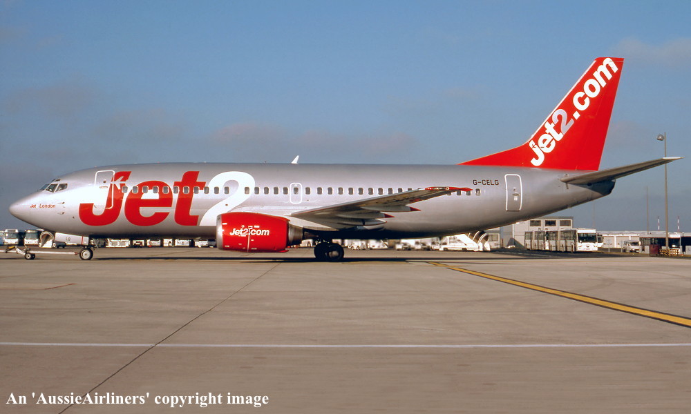 G-CELG. Jet 2 - 'Jet 2 London' in the revised livery at Leeds Airport, January 2005. (R. N. Smith Collection Copyright Image 4620-466.) |