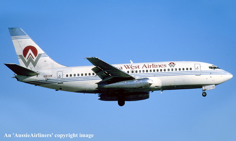 N182AW. America West Airlines - in the original livery at Tucson Airport, December 1988. (R. N. Smith Collection Copyright Image 4620-257.) |