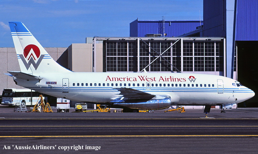 VH-CZR. America West Airlines - in the original livery at an unknown airport, March 1987. (R. N. Smith Collection Copyright Image 4622-061.) |