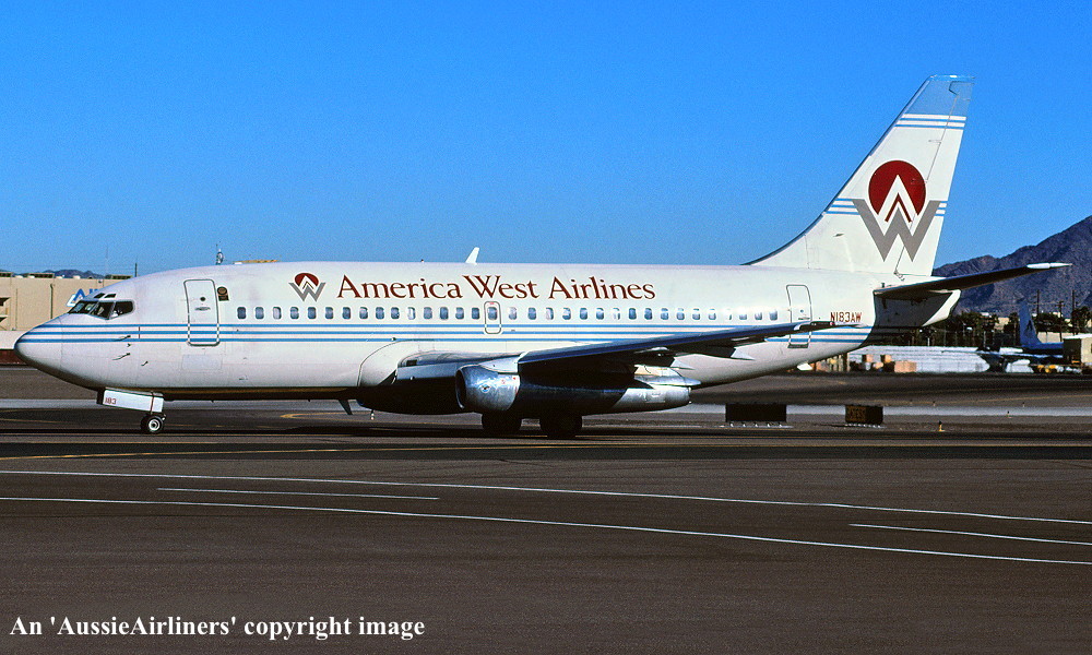 N183AW. America West Airlines - in the original livery at an unknown airport, January 1998. (R. N. Smith Collection Copyright Image 4622-127.) |