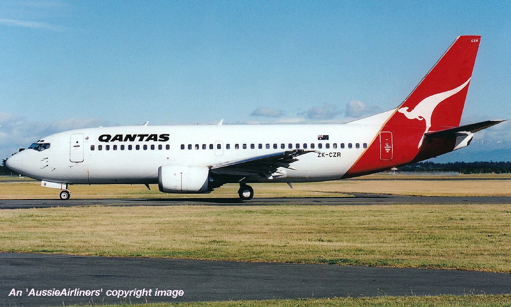 ZK-CZR. Qantas - in the standard livery at Christchurch Airport, November 15, 2002. (Z. Rae Copyright Image 4622-372.) |