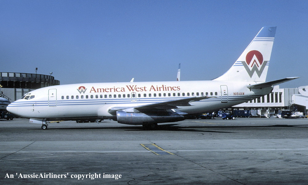 N184AW. America West Airlines - in the standard livery at Los Angeles Airport, March 1987. (R. N. Smith Collection Copyright Image 4620-043.) |