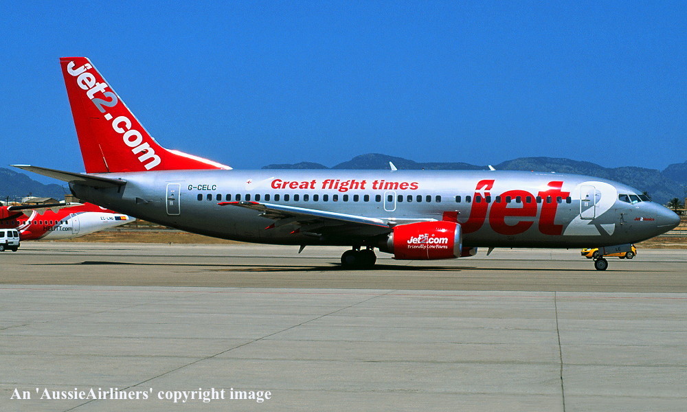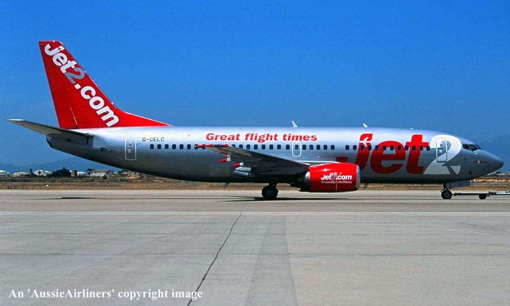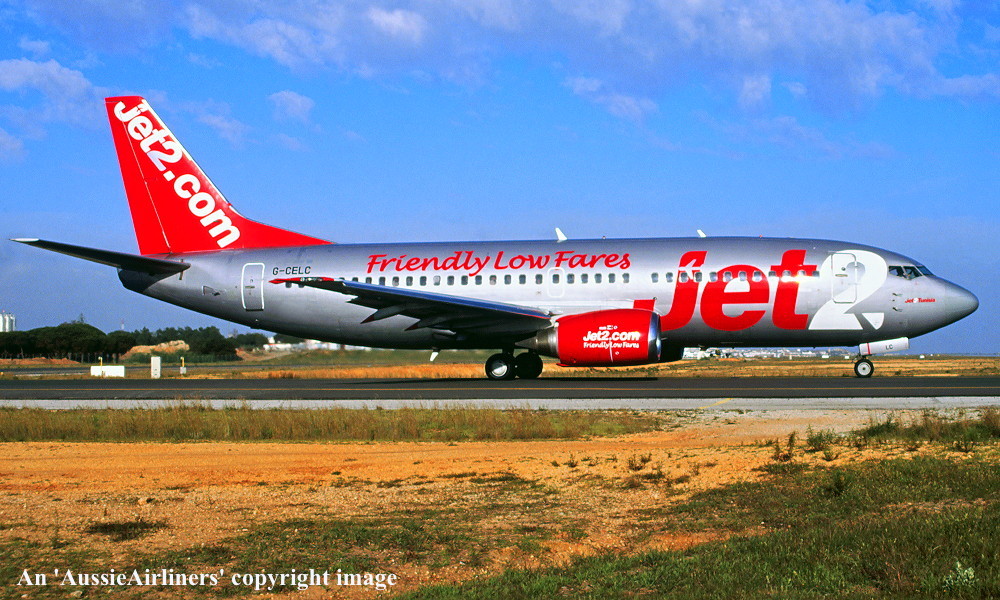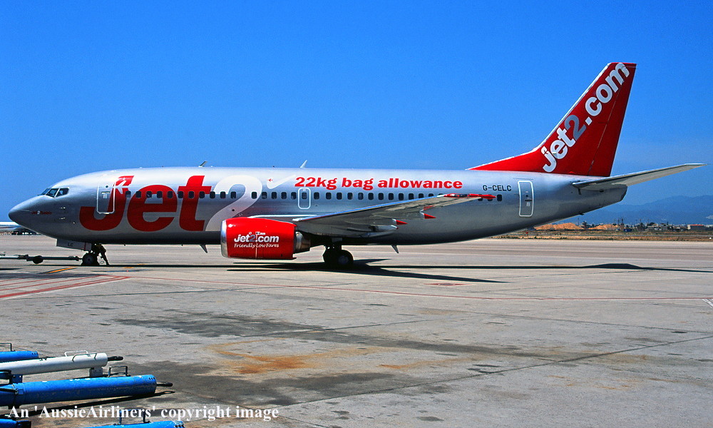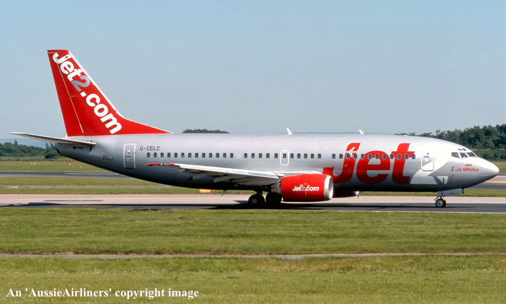 G-CELC. Jet 2 - 'Jet 2 Venice' in the revised livery with additional 'Great Flight Times' titles at an unknown airport, July 2012. (R. N. Smith Collection Copyright Image 4622-029.) |