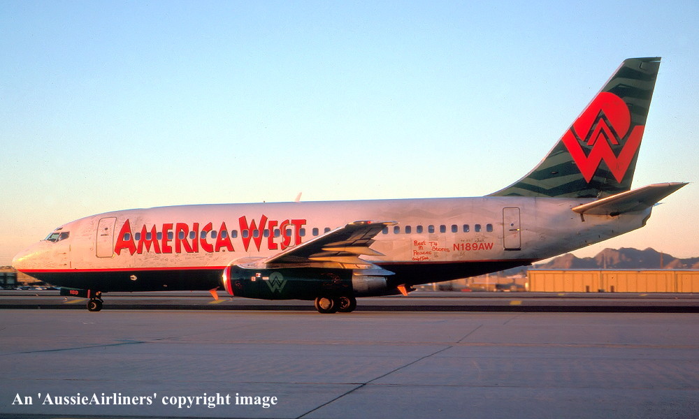 N189AW. America West - in the revised livery with additional employee signatures at Phoenix Airport, January 2005. (R. N. Smith Collection Copyright Image 4620-536.) |