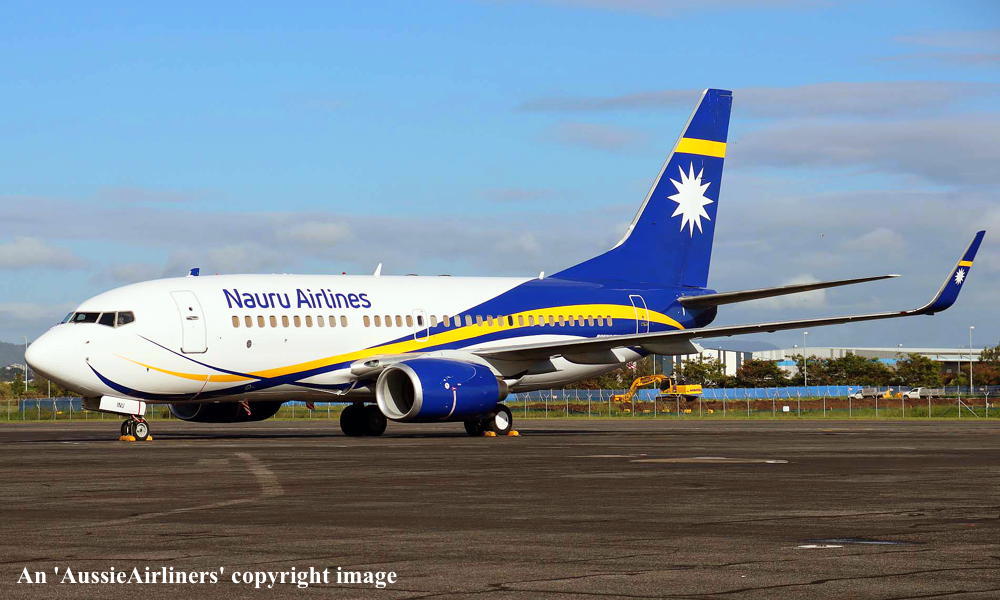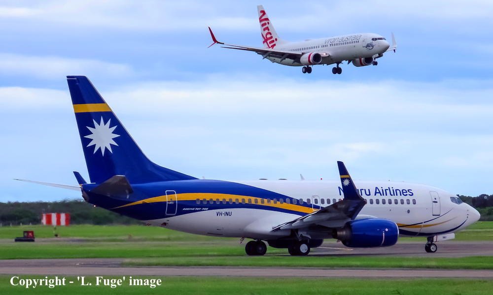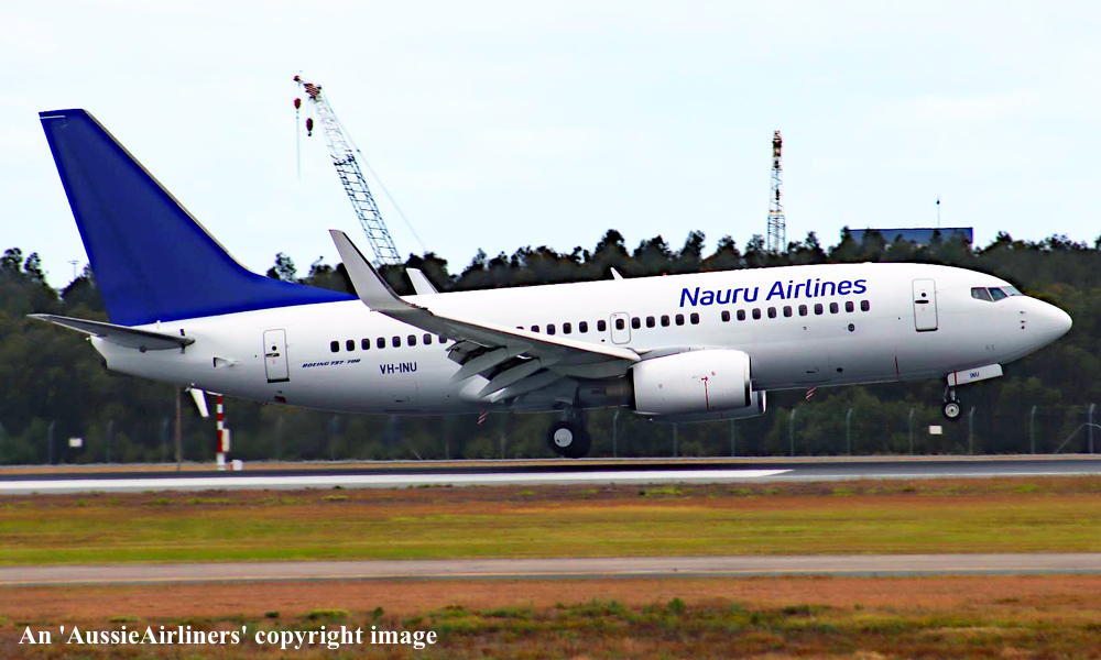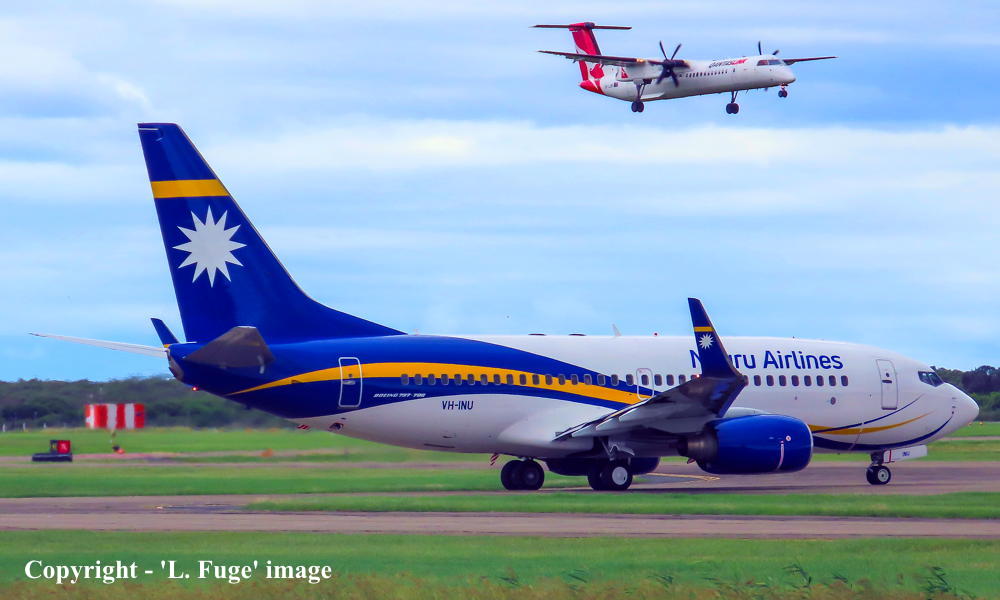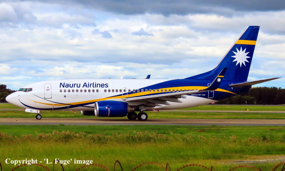 VH-INU. Nauru Airlines - in the non-standard livery at Brisbane Airport, September 27, 2021. (L. Fox Copyright Image 4622-920.) |