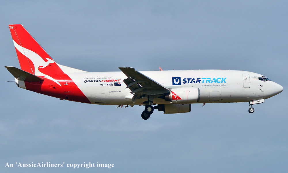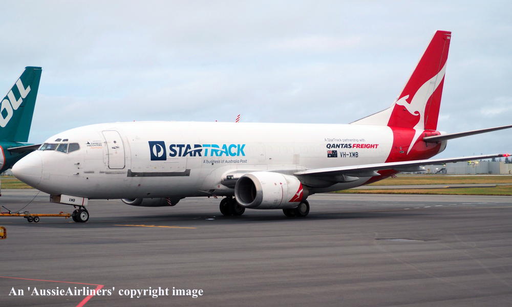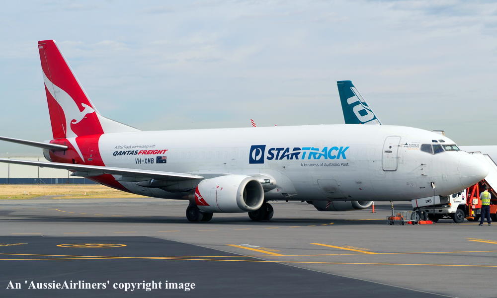 VH-XMB. Qantas Freight - in the standard livery with additional 'Australia Post Startrack' titles at Perth Airport, August 08, 2016. (J. A. Fox Copyright Image 4621-604.) |