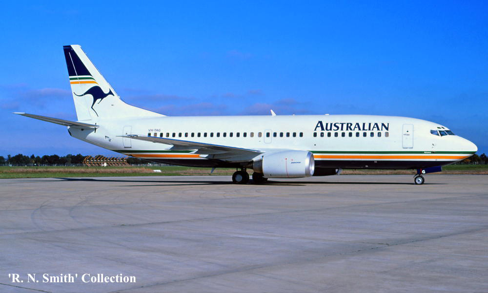 VH-TAG. Australian - 'Advance' in the standard livery at Melbourne Tullamarine Airport, August 1986. (R. N. Smith Collection Copyright Image 4623-418.) |