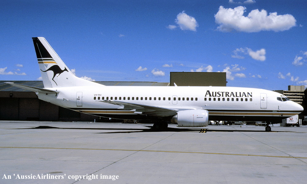 VH-TAI. Australian - 'Boldness' in the standard livery at Sydney Kingsford Smith Airport, August 1987. (N. Louis Copyright Image 4622-678.) |