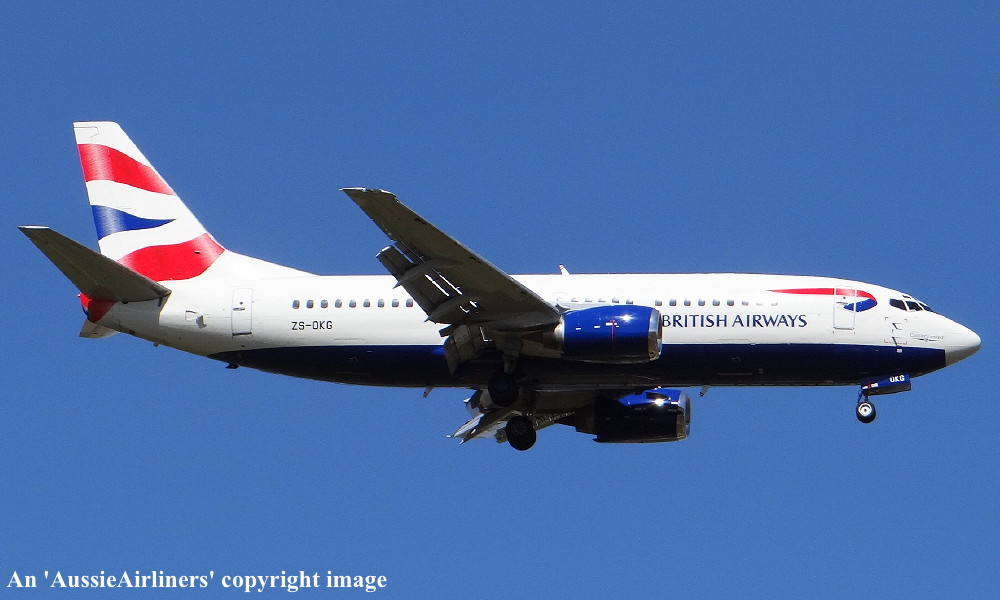 This was the fourth of twelve aircraft ordered new by Australian Airlines (T.A.A.) - May 27, 1985 Rolled off the Boeing production line at Seattle - July 21, 1986 Powered by CFM International CFM56-3C1 engines Trans-Australia Airlines (T.A.A.) was renamed Australian Airlines - August 04, 1986 First flown at Seattle (Boeing Field) as VH-TAI - August 06, 1986 Entered onto the Australian Aircraft Register as VH-TAI - August 22, 1986 Registered to Australian National Airlines Commission, Melbourne Accepted by Australian Airlines at Seattle - August 22, 1986 Departed Seattle (Boeing Field) on the delivery flight to Australia as TN1396 - August 24, 1986 It arrived at Melbourne (Tullamarine) on completion of the delivery flight - August 26, 1986 Delivery route: Seattle (Boeing Field) - Oakland - Hilo - Pago Pago - Noumea - Melbourne The aircraft was named 'Boldness' Operated its first revenue service Melbourne (Tullamarine) - Sydney (Kingsford Smith) as TN534 - August 30, 1986 Australian Airlines was sold to Qantas Airways Ltd - September 14, 1992 Australian Airlines was merged with Qantas AirwaysLtd - October 31, 1993 Ownership transferred to Qantas Airways Ltd, Sydney - December 08, 1993 It was observed at Perth in the Qantas livery with 'The Spirit of Australia' titles - January 02, 1998 Operated its final revenue service Adelaide (West Beach) - Melbourne (Tullamarine) as QF694 - October 17, 2003 Sold to Comair, South Africa Cancelled from the Australian Aircraft Register - October 31, 2003 Entered onto the South African Aircraft Register as ZS-OKG - October 31, 2003 Departed Melbourne (Tullamarine) on the ferry flight to South Africa in basic Qantas livery - November 01, 2003 Delivery route: Melbourne - Port Headland - Cocos Island - Male - Mahe - Johannesburg Operated by Comair as a British Airways franchise in the standard British Airways livery The aircraft was permanently withdrawn from service at Johannesburg - November 2011 Scrapped at Johannesburg - September 2015 |