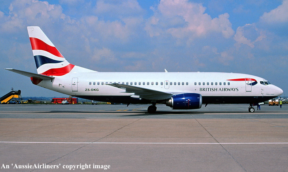 ZS-OKG. British Airways Comair - in the standard livery at Johannesburg Airport, March 2004. (R. N. Smith Collection Copyright Image 4622-268.) |
