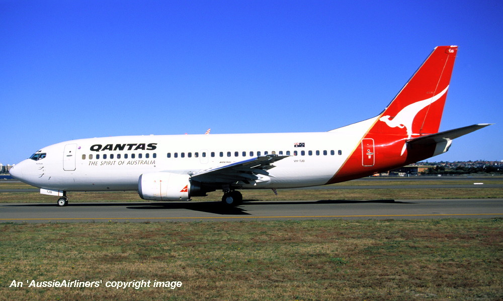 VH-TJB. Qantas The Spirit Of Australia - 'Fortitudel' in the standard livery at Sydney Kingsford Smith Airport, July 2002. (R. N. Smith Copyright Image 4620-226.) |