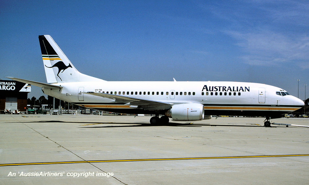 VH-TJB. Australian - 'Fortitude' in the standard livery at Melbourne Tullamarine Airport, January 19, 1990. (R. N. Smith Copyright Image 4620-288.) |