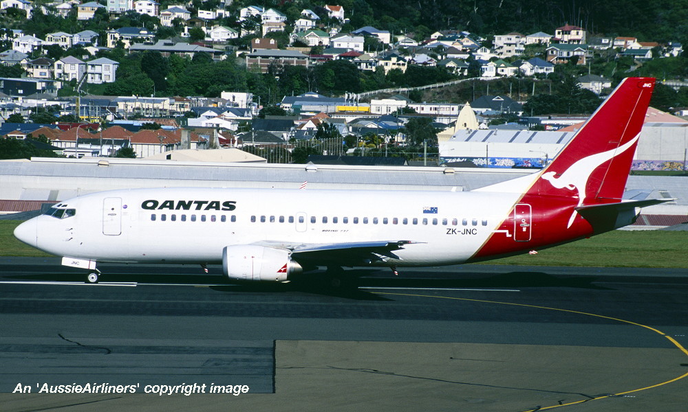 ZK-JNC. Qantas - in the standard livery at Wellington Airport, July 2005. (G. Reid Copyright Image 4621-123.) |