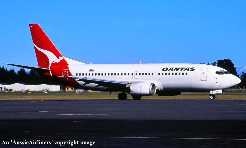 ZK-JNC. Qantas - in the standard livery at Christchurch Airport, February 04, 2007. (Z. Rae Copyright Image 4622-381.) |
