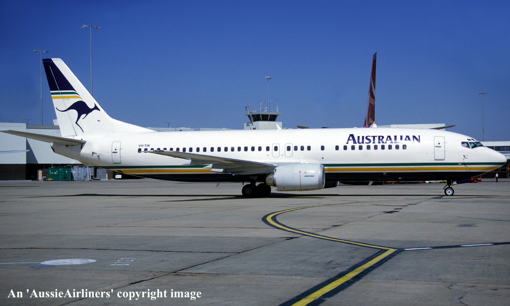 VH-TJK. Australian - 'Ibis' in the standard livery at Melbourne Tullamarine Airport, February 1993. (R. N. Smith Collection Copyright Image 4620-292.) |