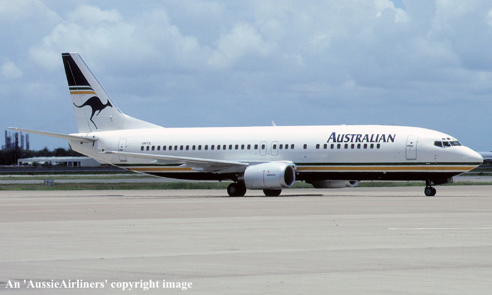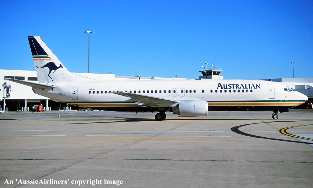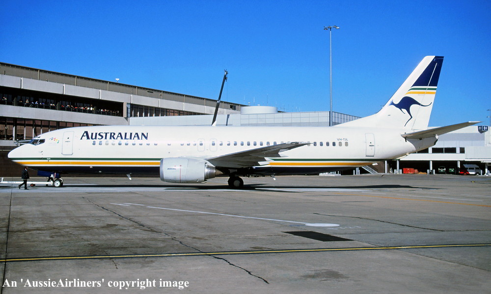 VH-TJL. Australian - 'Swift' in the standard livery at Melbourne Tullamarine Airport, July 1993. (R. N. Smith Collection Copyright Image 4620-507.) |