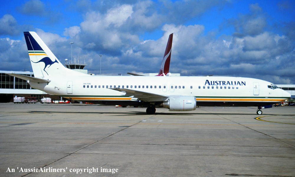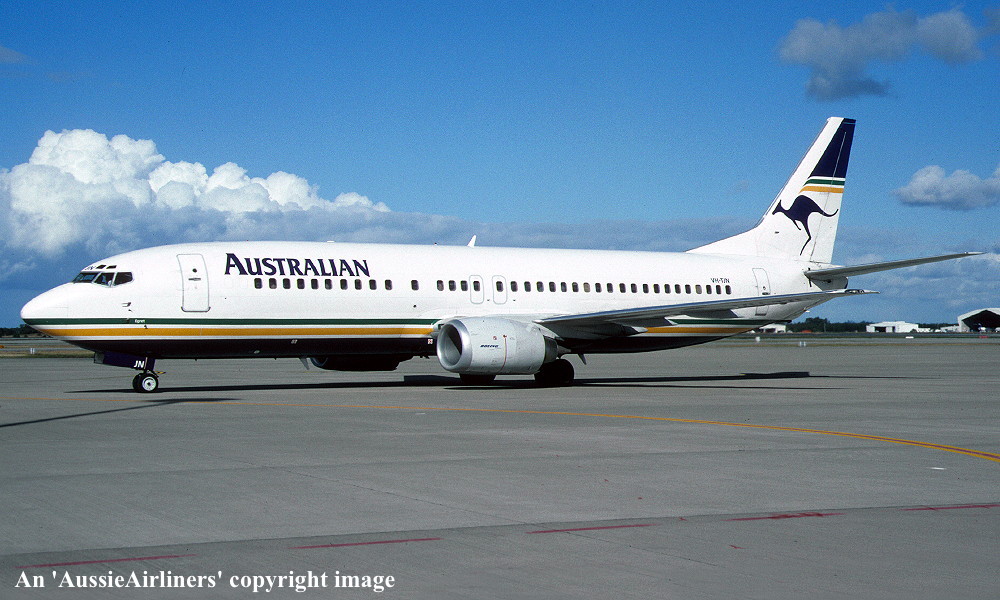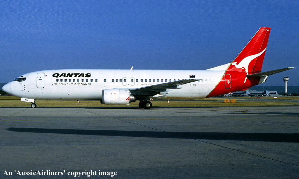 VH-TJN. Boeing 737-476. c/n 24439-2265. Was also registered as: ZK-JTR; N249SY; OM-SAA. |