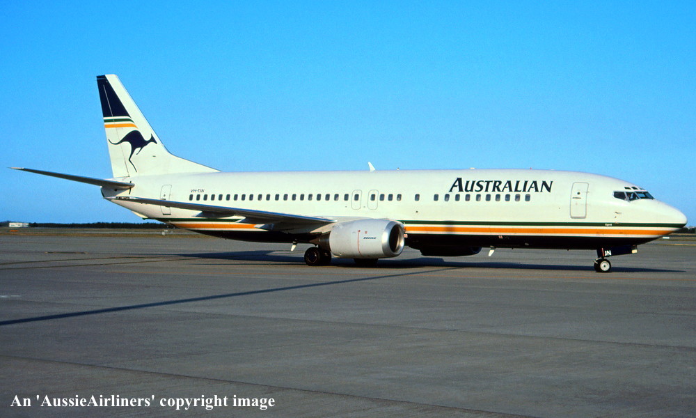VH-TJN. Australian - 'Egret' in the standard livery at Melbourne Tullamarine Airport, October 1993. (R. N. Smith Collection Copyright Image 4622-961.) |