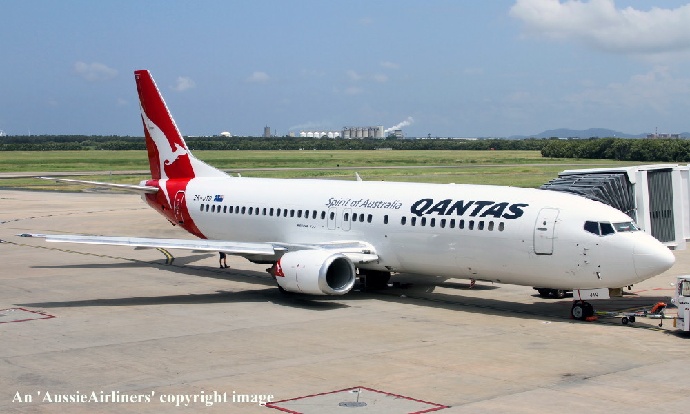 ZK-JTQ. Qantas Spirit of Australia - in the 'New Roo' livery at Brisbane Airport, February 06, 2011. (R. N. Smith Collection Copyright Image 4620-508.) |