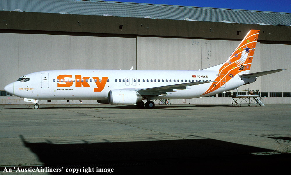 TC-SKE. Sky - 'Smile In The Sky' in the standard livery at Melbourne Tullamarine Airport, February 2004. (R. N. Smith Collection Copyright Image 4620-243.) |