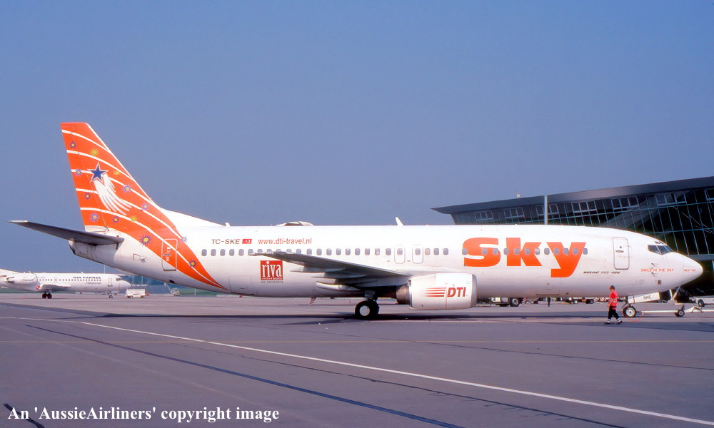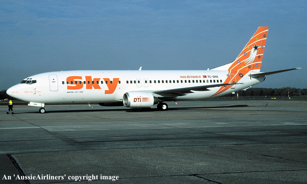 TC-SKE. Sky - 'Smile In The Sky' in the standard livery with additional 'dti.travel' titles at an unknown airport, April 2004. (R. N. Smith Collection Copyright Image 4620-244.) |