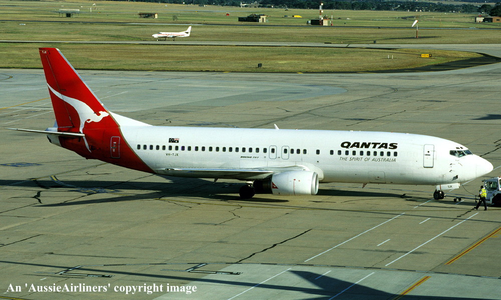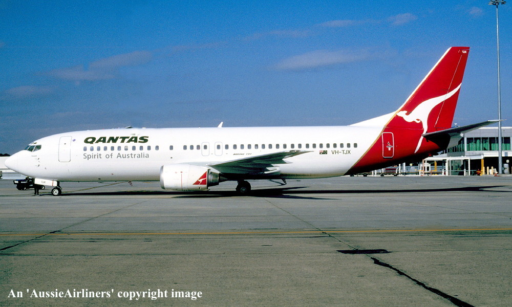 VH-TJX. Qantas The Spirit Of Australia - 'Trust' in the original livery at Melbourne Tullamarine Airport, February 2001. (R. N. Smith Collection Copyright Image 4620-229.) |