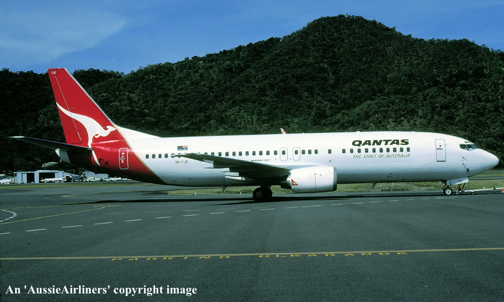 VH-TJZ. Qantas The Spirit Of Australia - 'Integrity' in the original livery at Cairns Airport, June 1998. (R. N. Smith Collection Copyright Image 4620-095.) |
