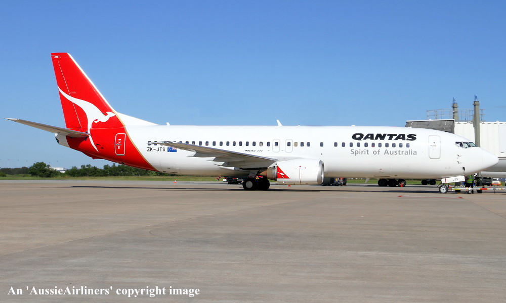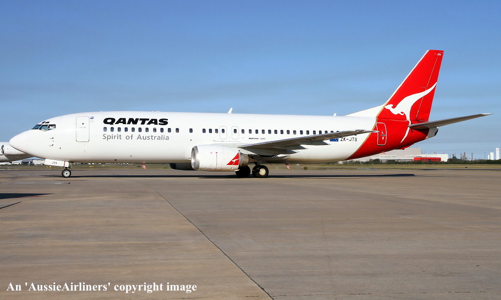 ZK-JTS. Qantas Spirit of Australia - in the revised livery at Brisbane Airport, May 03, 2010. (R. N. Smith Collection Copyright Image 4620-492.) |