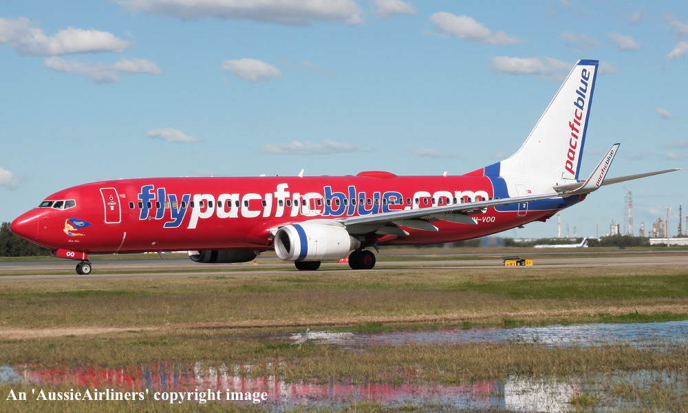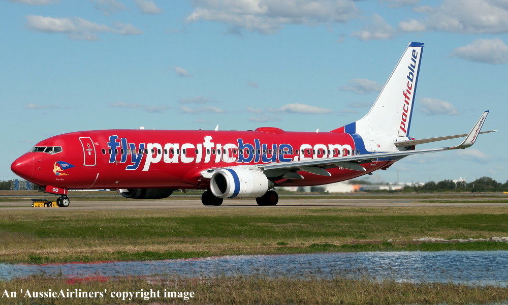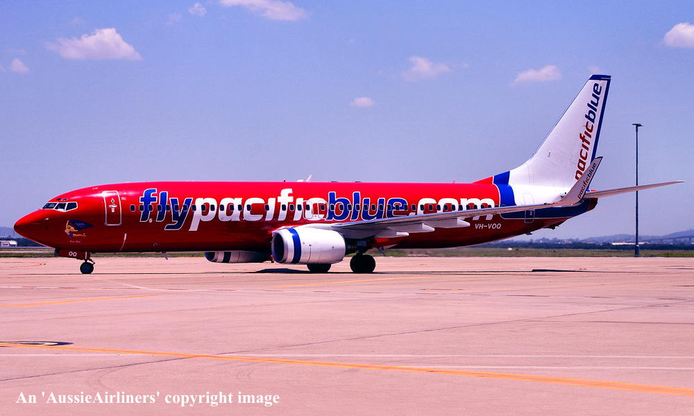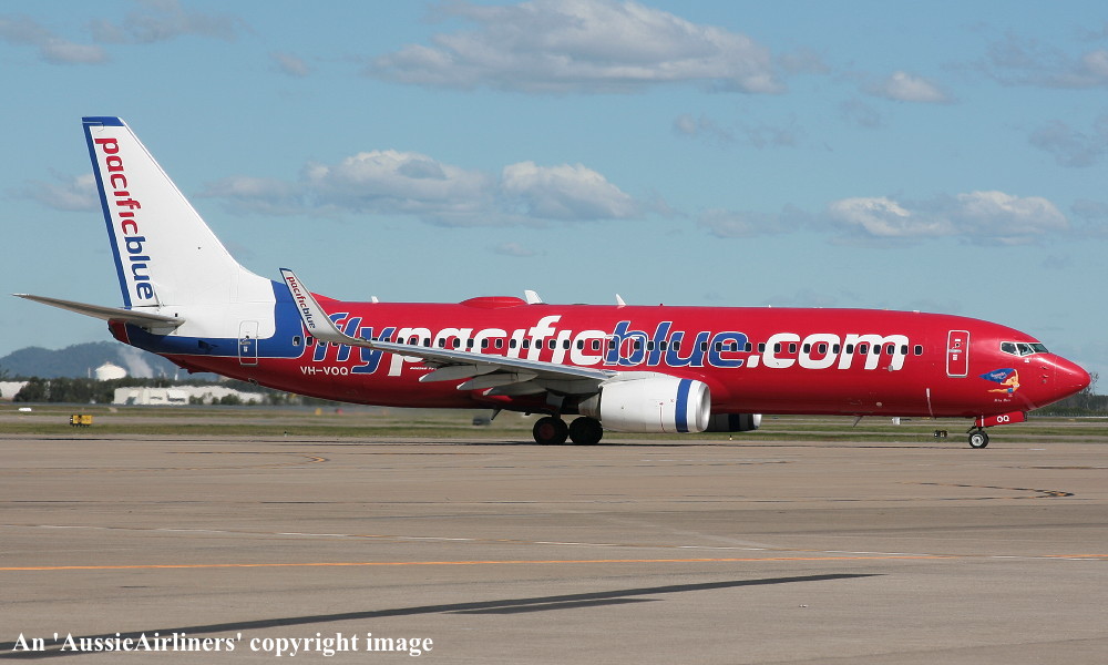 VH-VOQ. Pacific Blue - 'Peter Pan' in the standard livery at Brisbane Airport, July 26, 2008. (R. N. Smith Collection Copyright Image 4620-435.) |