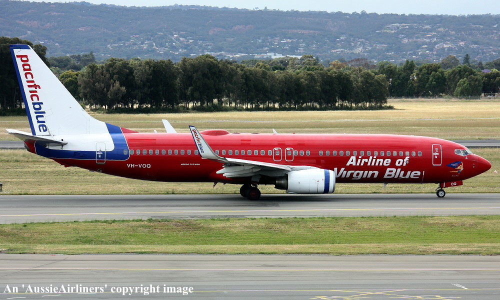 VH-VOQ. Pacific Blue - 'Peter Pan' in the standard livery at Brisbane Airport, July 26, 2008. (R. N. Smith Collection Copyright Image 4620-434.) |