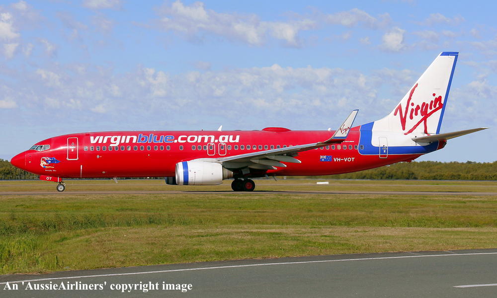 VH-VOT. Virgin Blue - 'Butterfly Blue' in the standard livery at Brisbane Airport, July 21, 2013. (R. N. Smith Collection Copyright Image 4622-630.) |