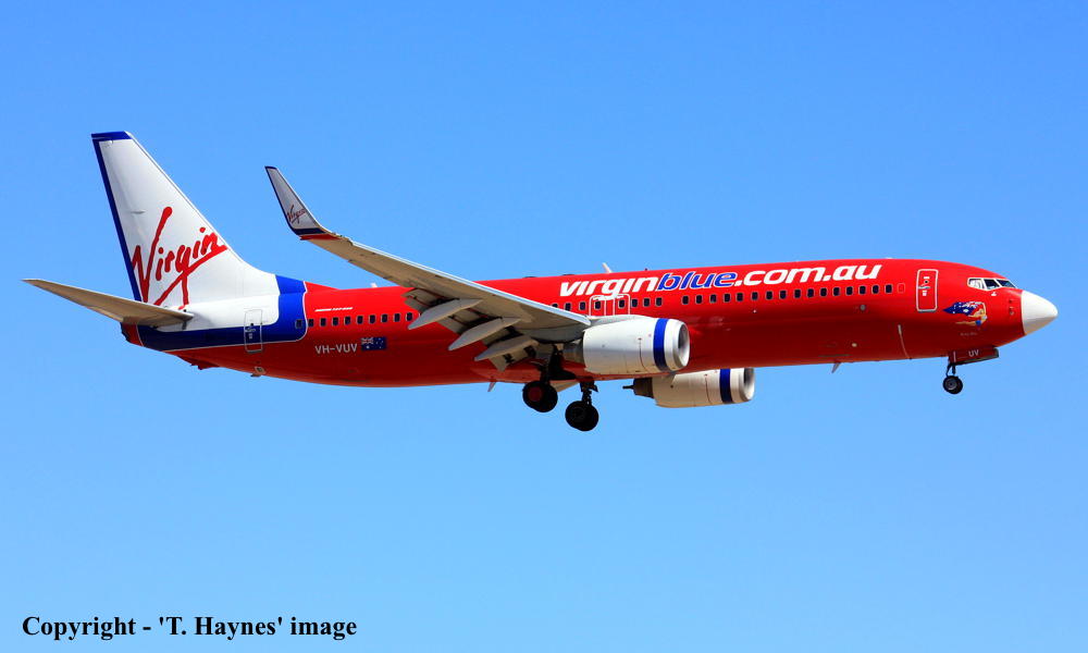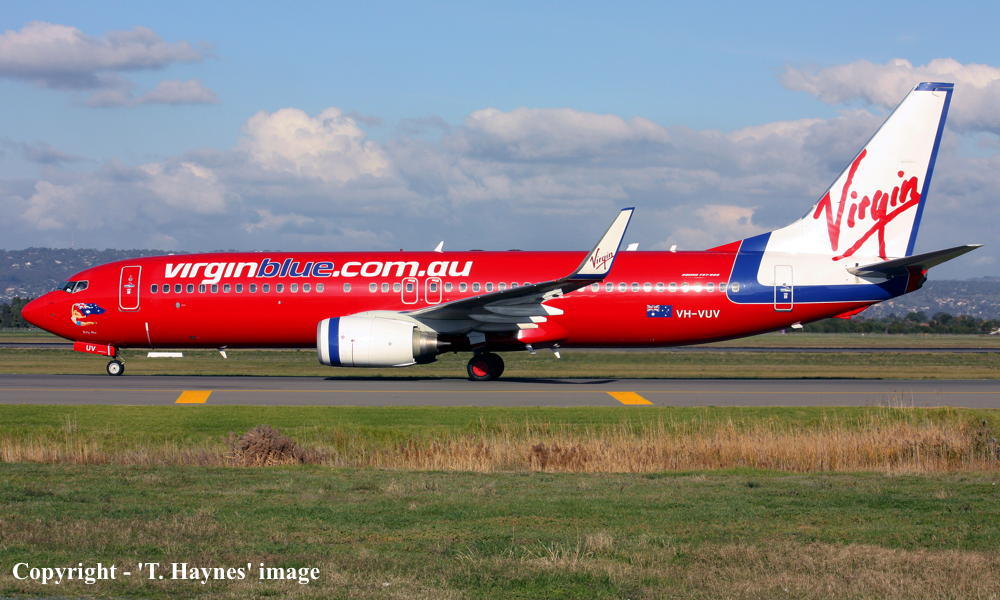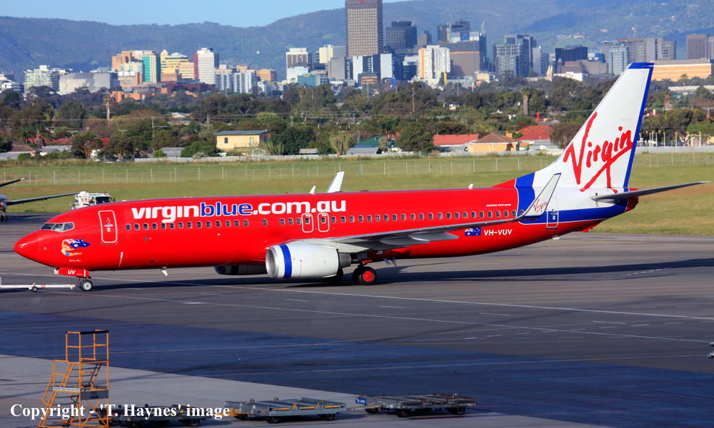 VH-VUV. Virgin Blue - 'Ruby Blue' in the standard livery at Adelaide West Beach Airport, January 19, 2014. (T. Haynes Copyright Image 4623-208.) |