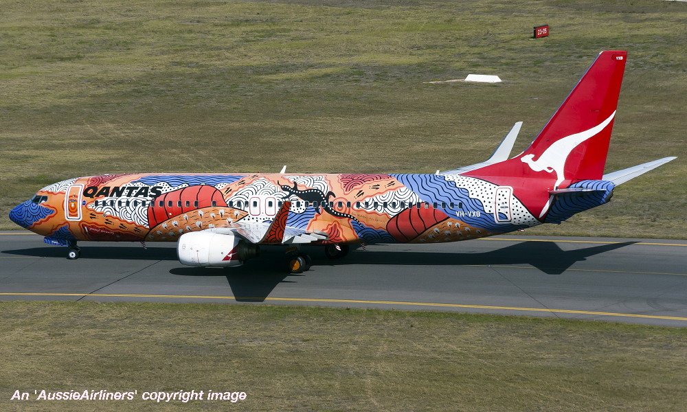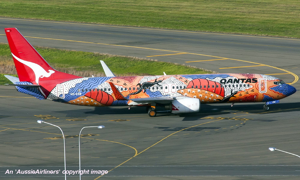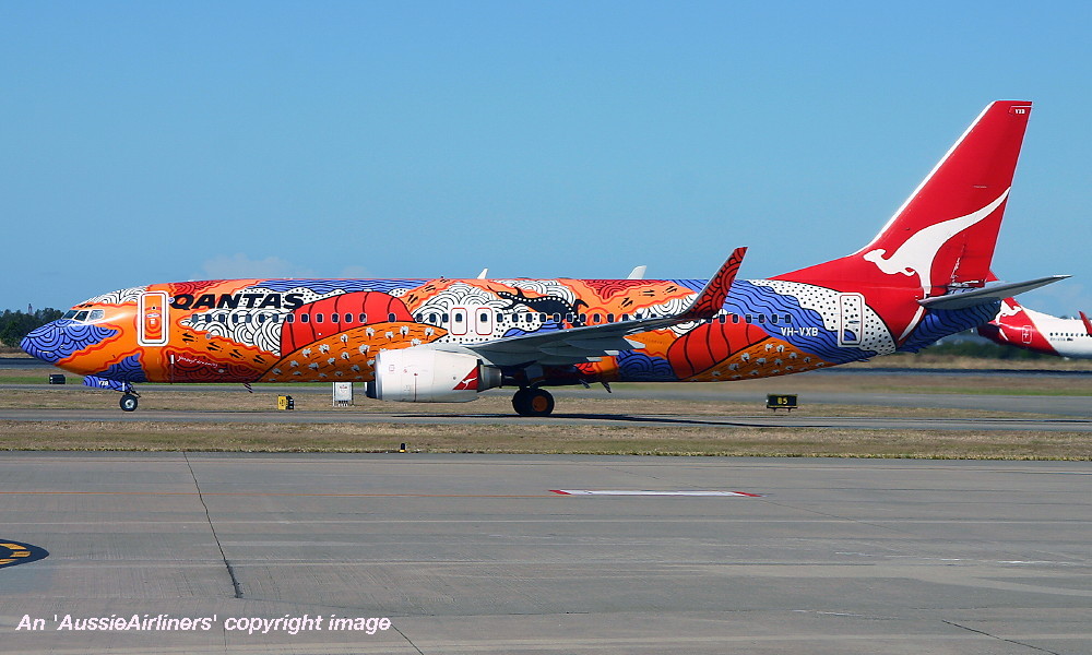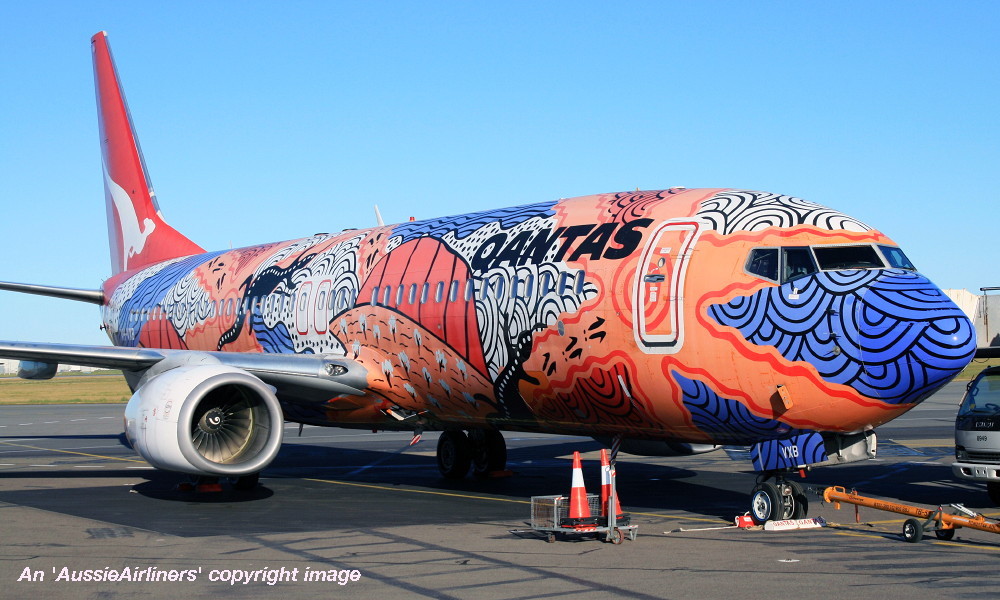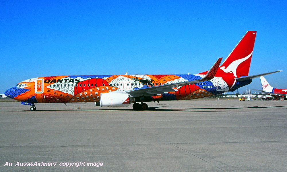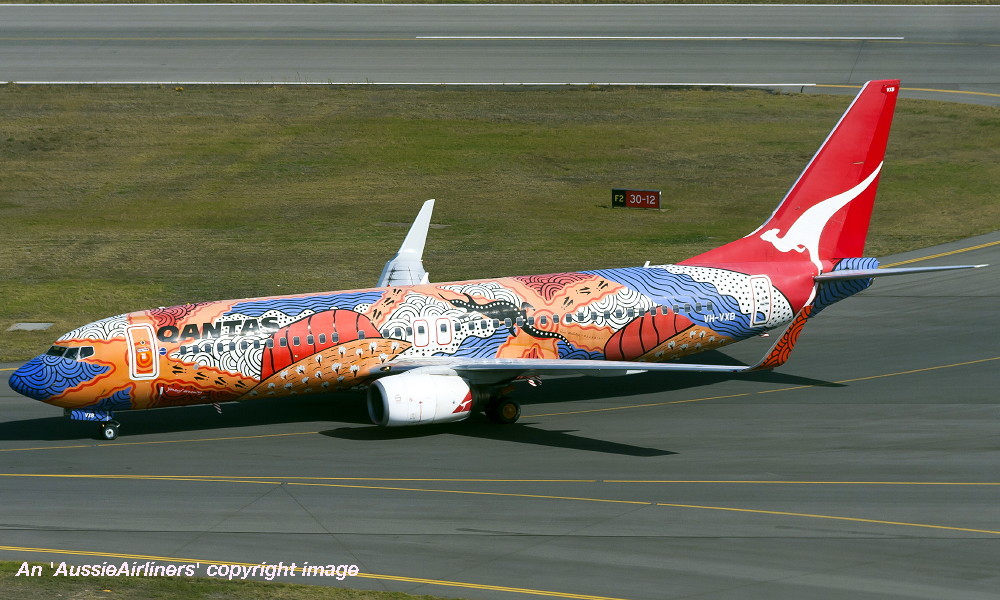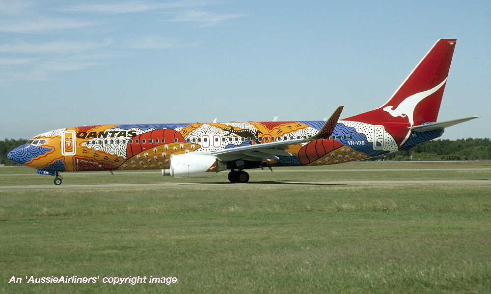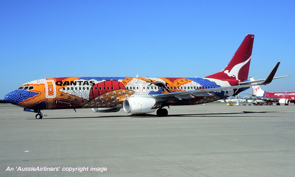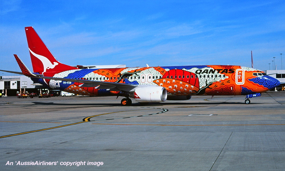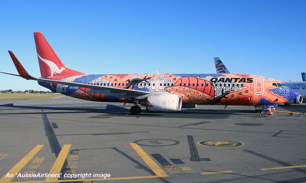 VH-VXB. Qantas - 'Yananyi Dreaming' in the special livery at Perth Airport, September 29, 2008. (R. N. Smith Collection Copyright Image 4621-789.) |
