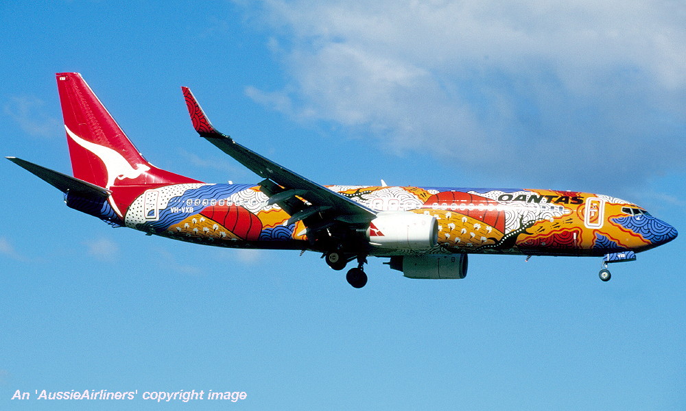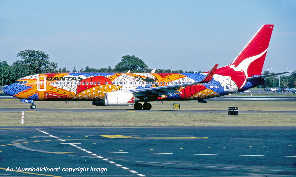 VH-VXB. Qantas - 'Yananyi Dreaming' in the special livery at Sydney Kingsford Smith Airport, June 23, 2003. (R. N. Smith Copyright Image 4620-192.) |