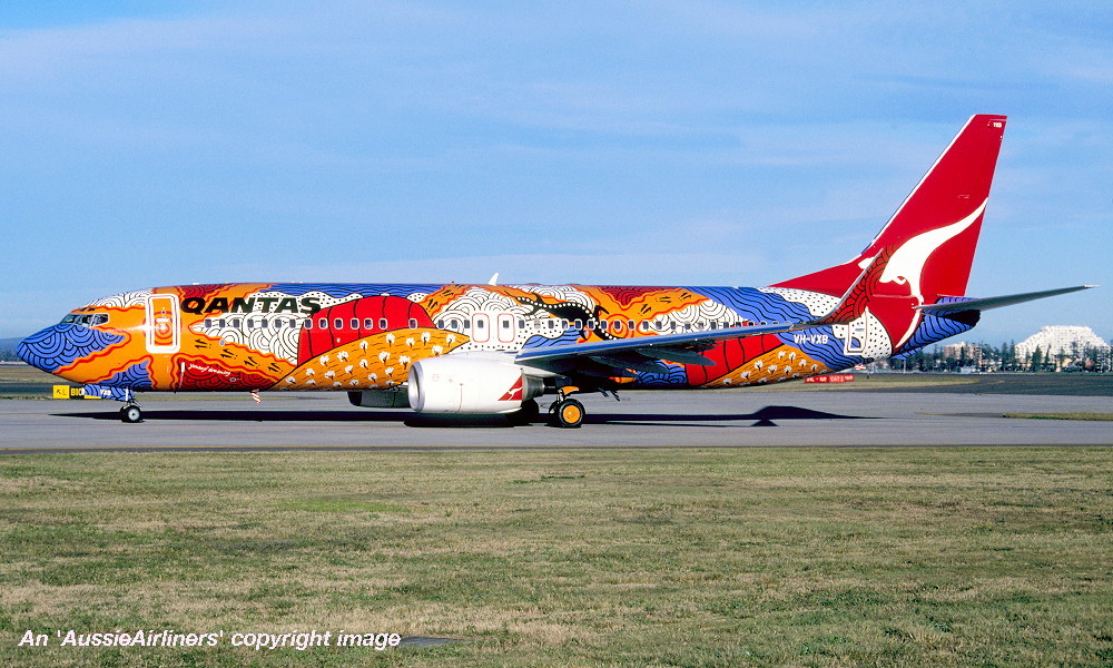 VH-VXB. Qantas - 'Yananyi Dreaming' in the special livery at Melbourne Tullamarine Airport, November 2002. (R. N. Smith Collection Copyright Image 4622-383.) |