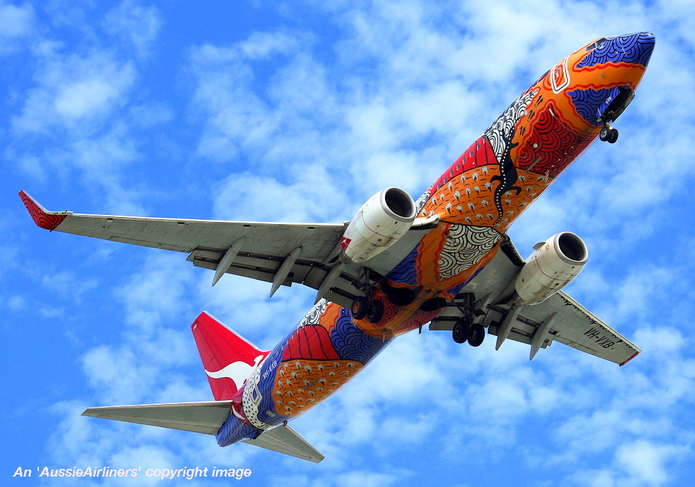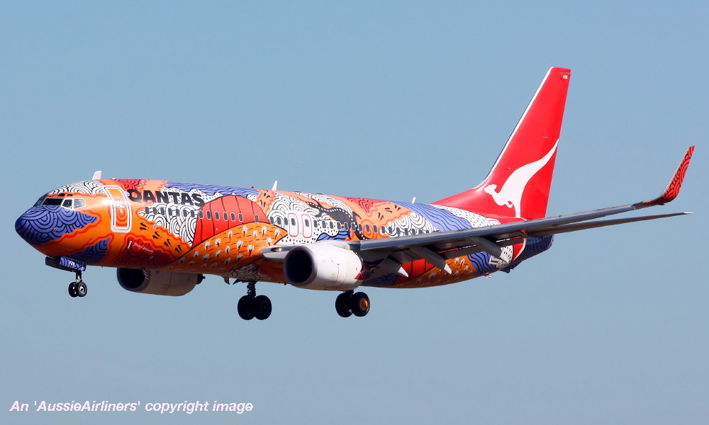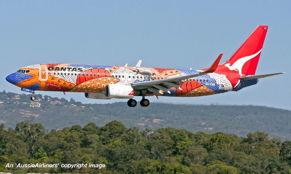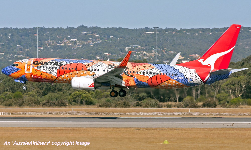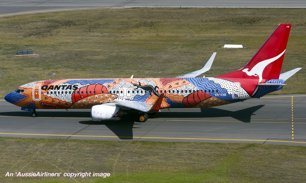 VH-VXB. Qantas - 'Yananyi Dreaming' in the special livery at Perth Airport, October 24, 2013. (R. N. Smith Collection Copyright Image 4621-787.) |