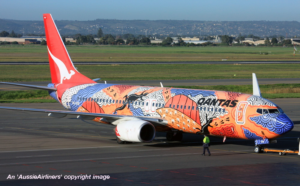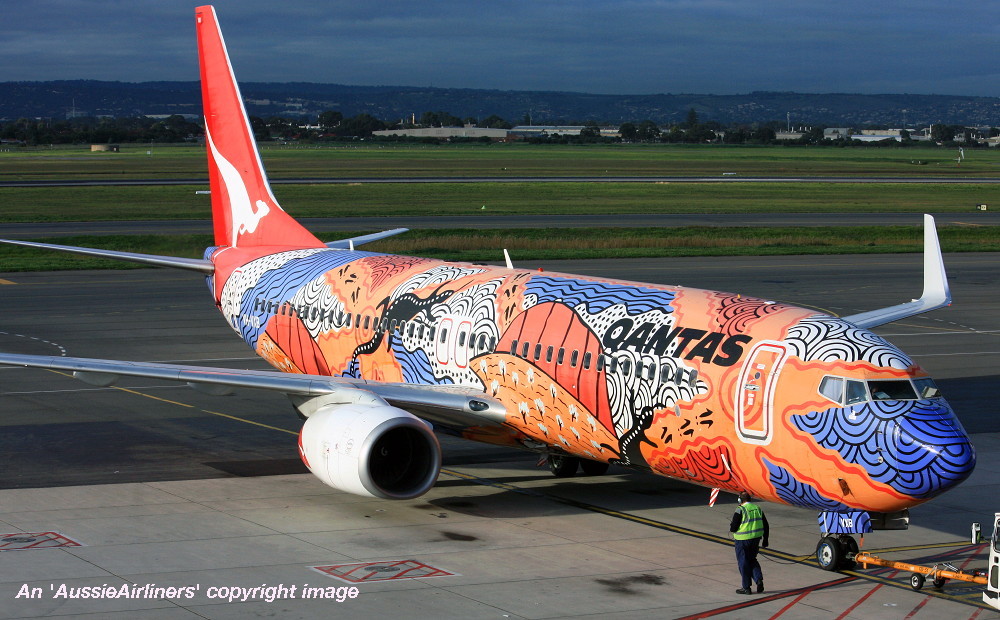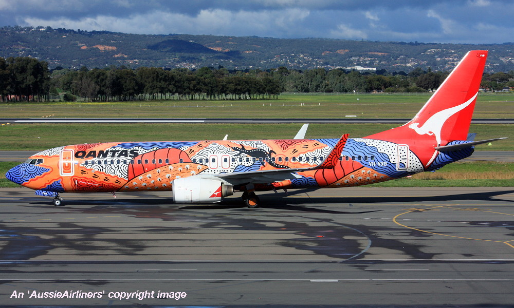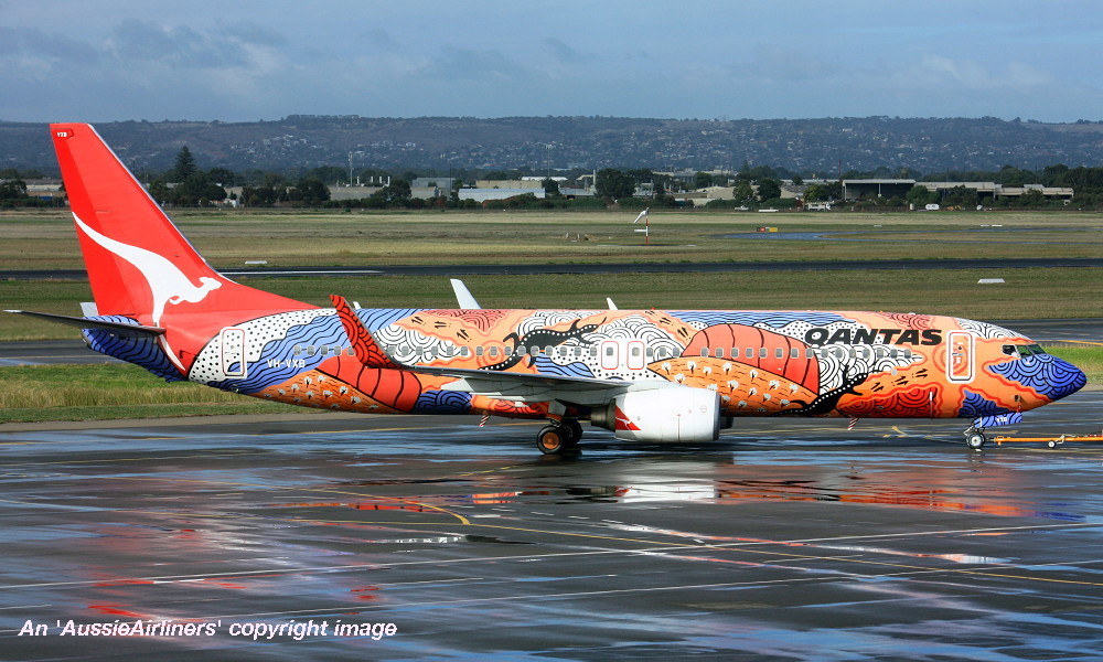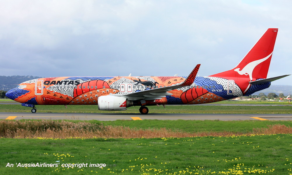 VH-VXB. Qantas - 'Yananyi Dreaming' in the special livery at Adelaide West Beach Airport, July 14, 2013. (R. Brown Copyright Image 4621-719.) |