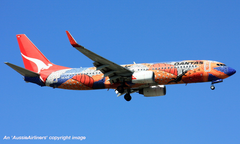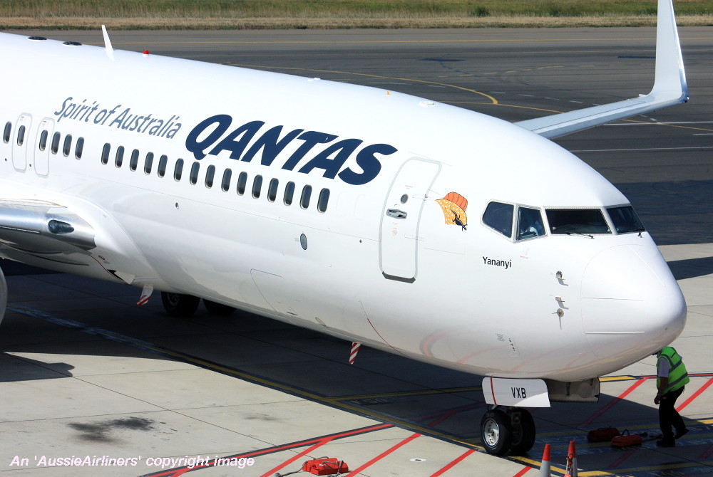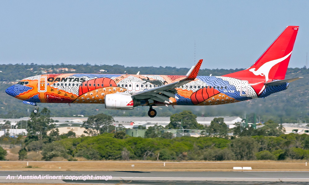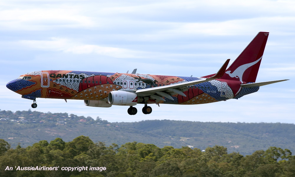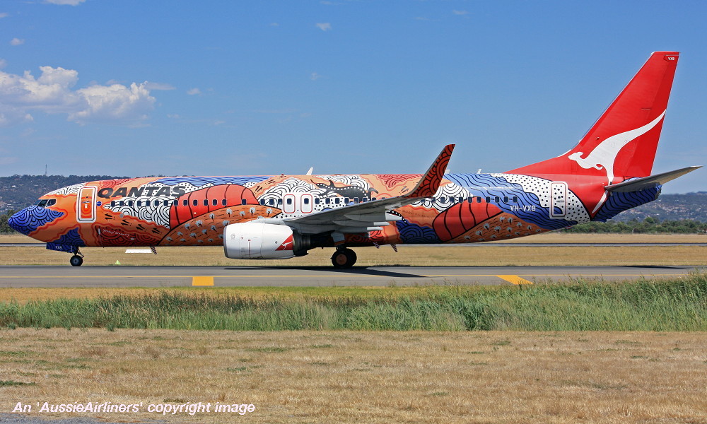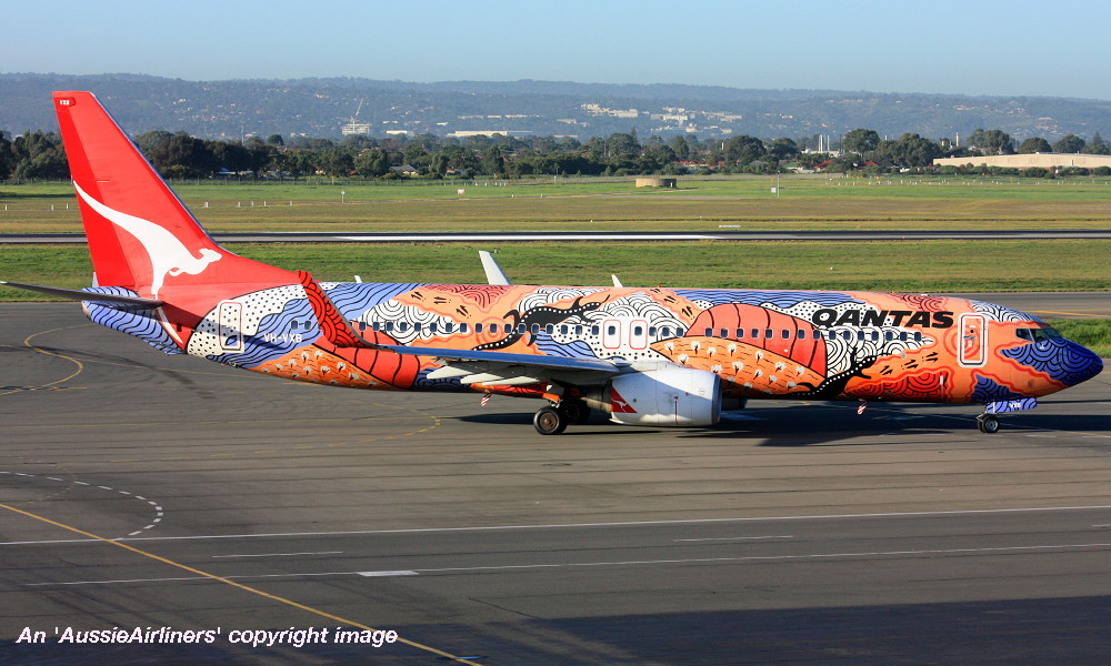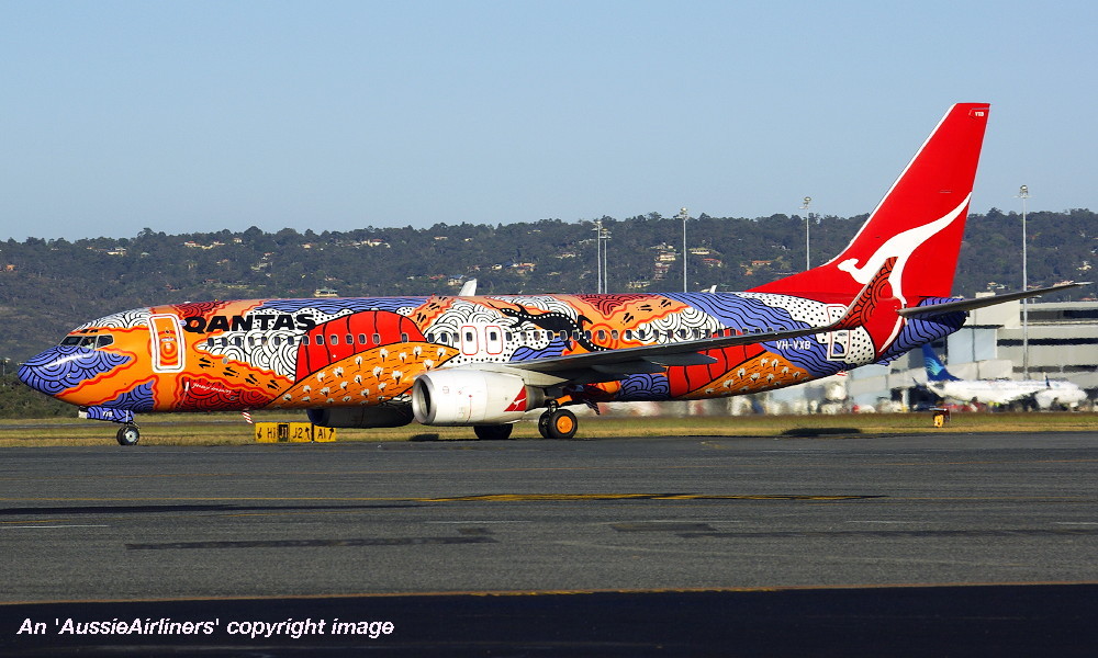 VH-VXB. Qantas - 'Yananyi Dreaming' in the special livery at Perth Airport, May 20, 2009. (R. N. Smith Collection Copyright Image 4621-788.) |