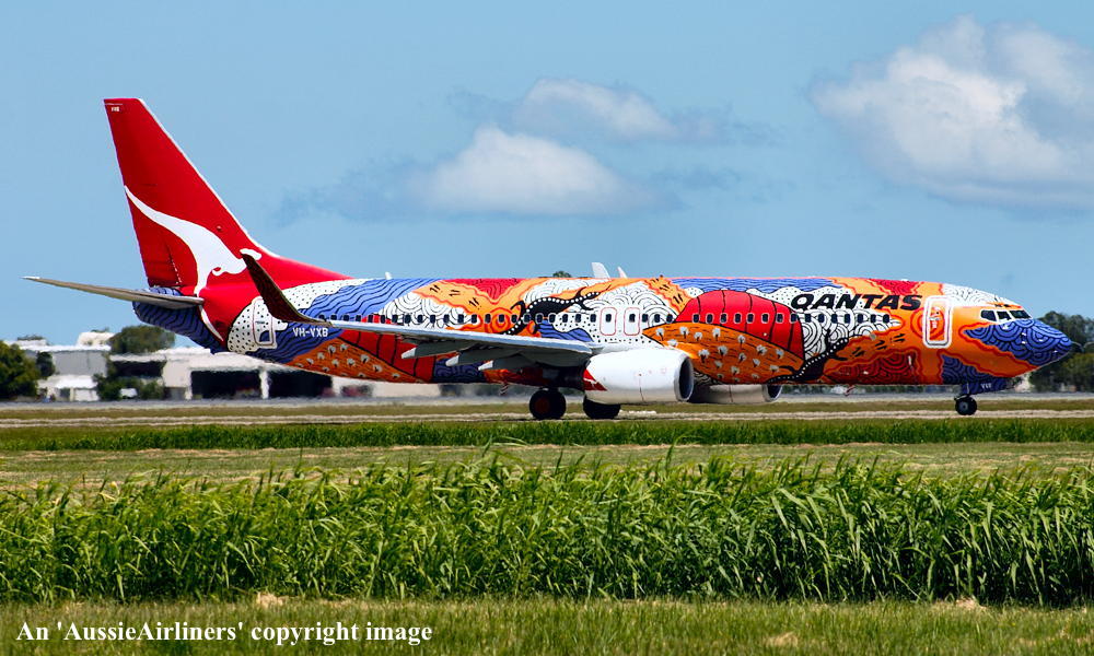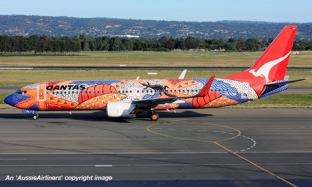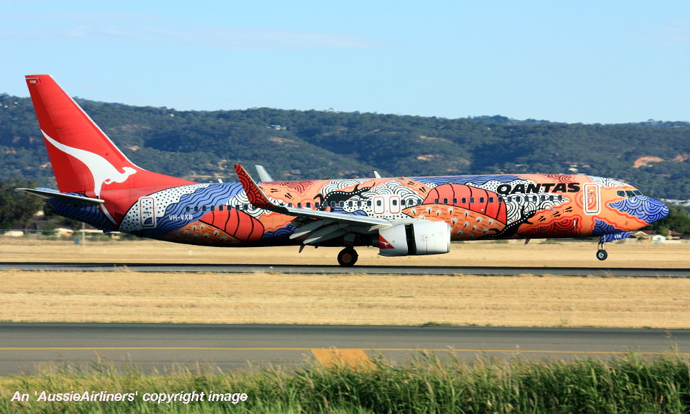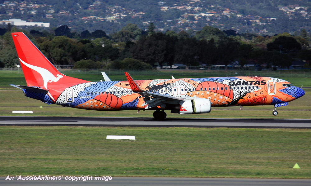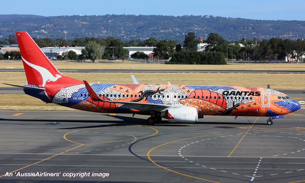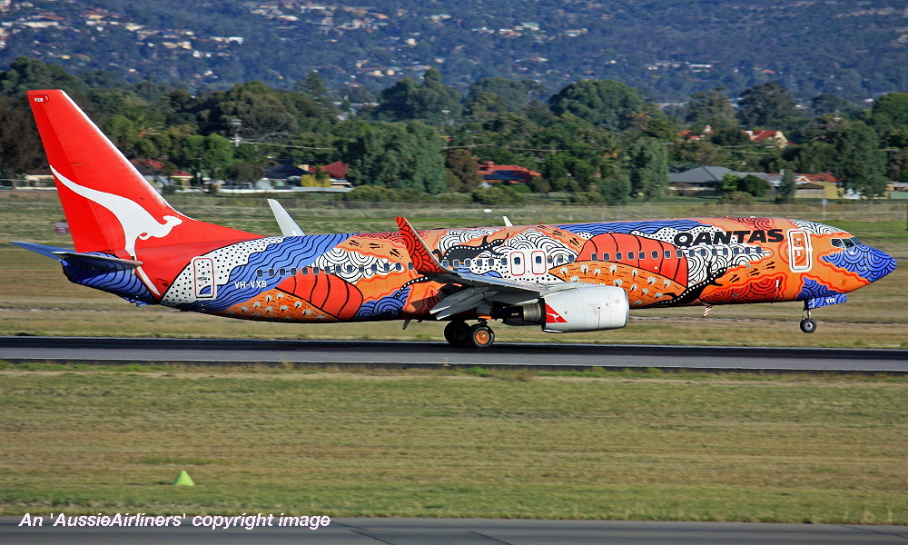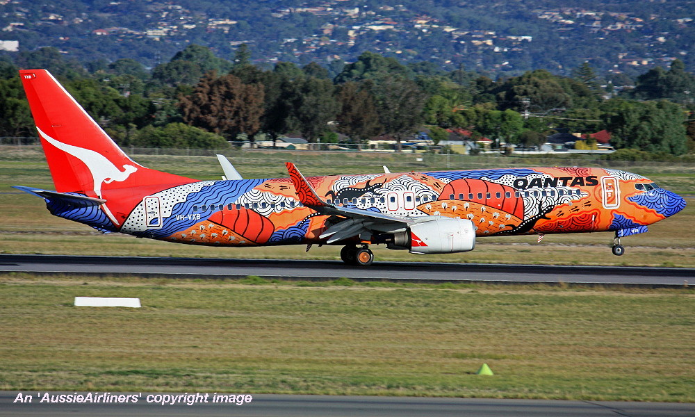 VH-VXB. Qantas - 'Yananyi Dreaming' in the special livery at Adelaide West Beach Airport, April 20, 2014. (R. Brown Copyright Image 4621-720.) |