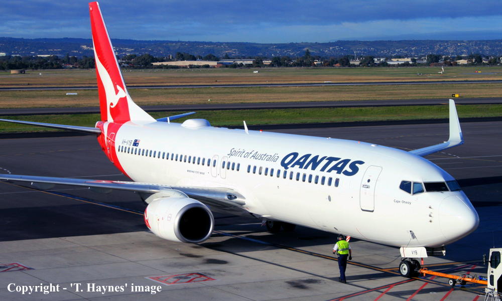 VH-VYB. Qantas Spirit of Australia - 'Cape Otway' in the 'New Roo' livery at Adelaide West Beach Airport, September 25, 2019. (T. Haynes Copyright Image 4622-564.) |