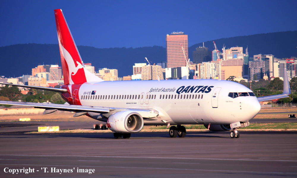 VH-VYB. Qantas Spirit of Australia - 'Cape Otway' in the 'New Roo' livery at Adelaide West Beach Airport, June 30, 2018. (T. Haynes Copyright Image 4623-270.) |