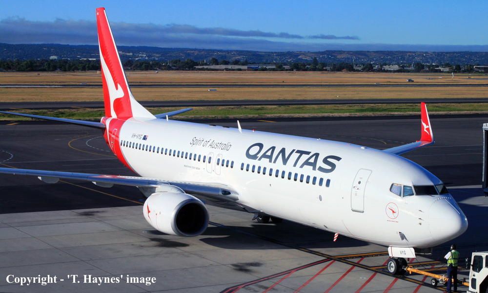 VH-VYG. Qantas Spirit of Australia - 'Australind' in the 'Silver Roo' livery at Adelaide West Beach Airport, April 17, 2019. (T. Haynes Copyright Image 4622-533.) |