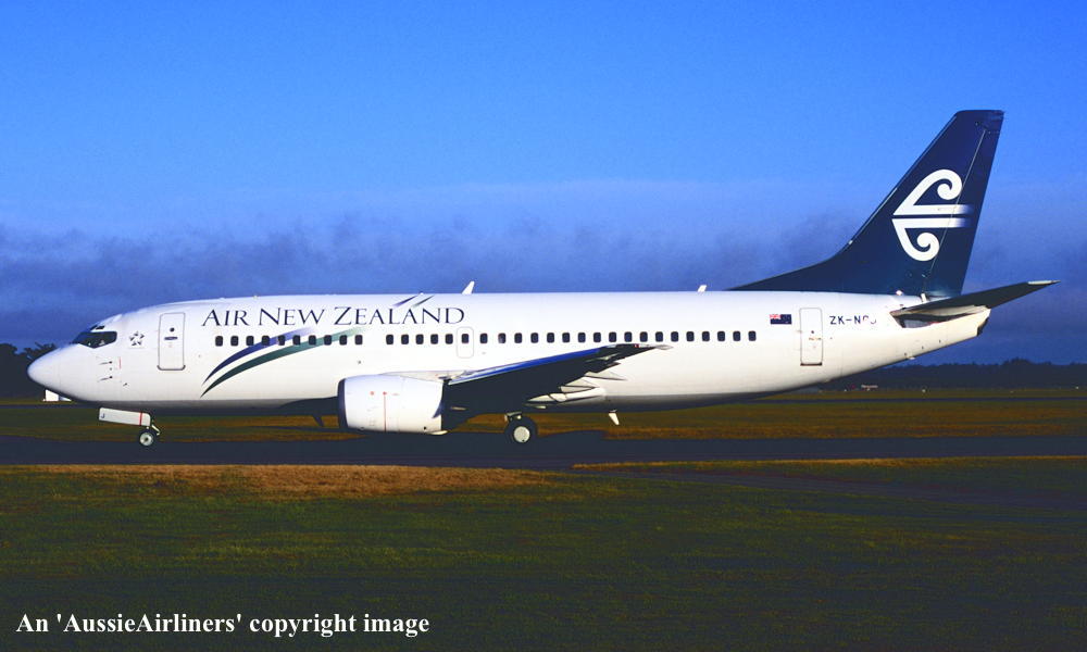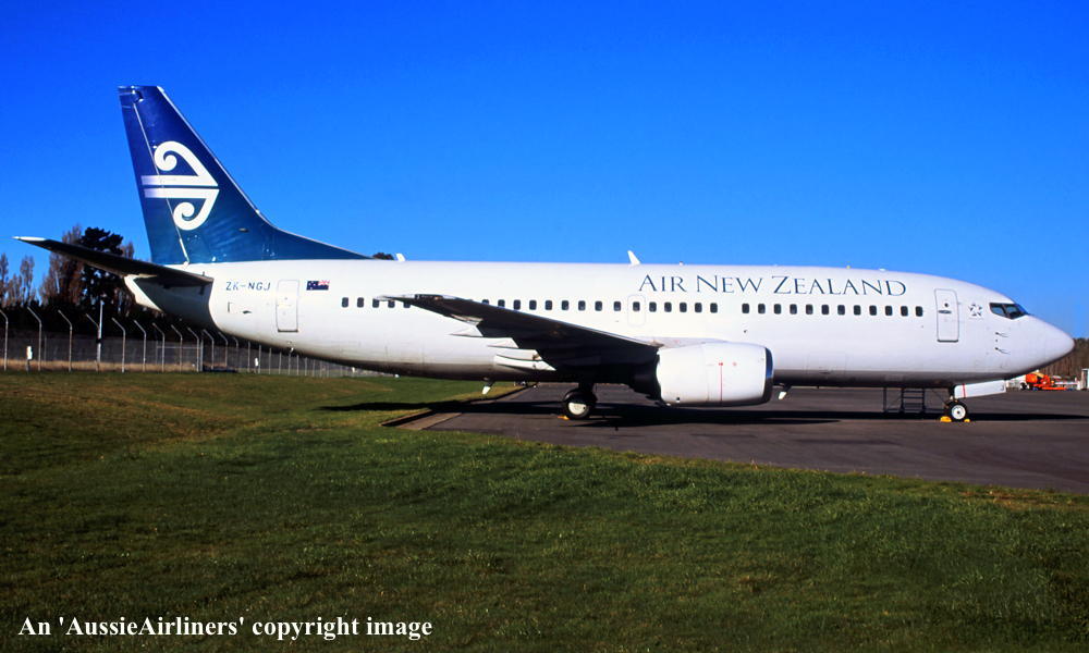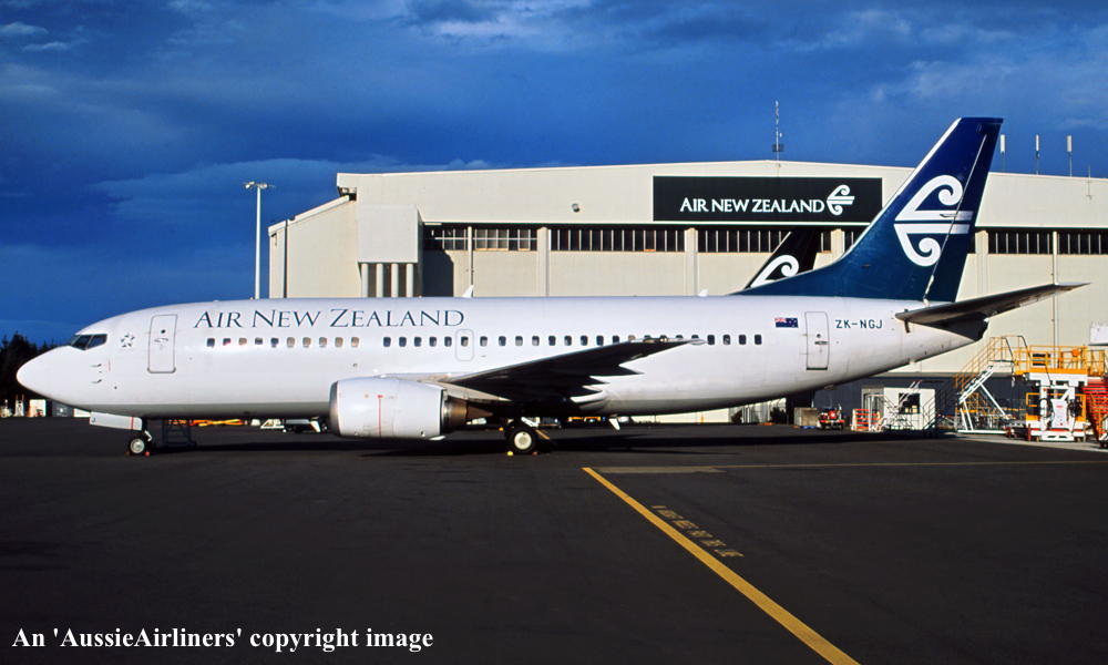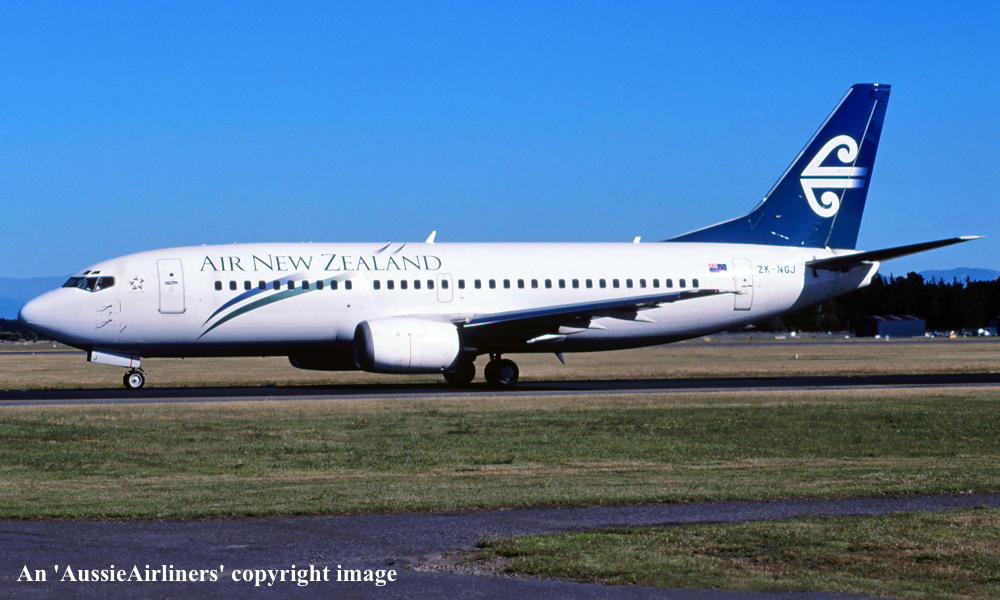 ZK-NGJ. Air New Zealand - in the 'Pacific Wave' livery at the Christchurch Airport, date unknown. (G. Reid Copyright Image 4622-448.) |