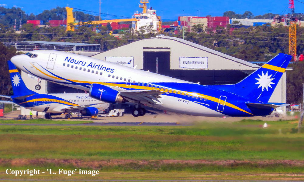 VH-XNU. Nauru Airlines - in the revised livery at the Brisbane Airport, April 02, 2023. (L. Fuge Copyright Image 4623-741.) |