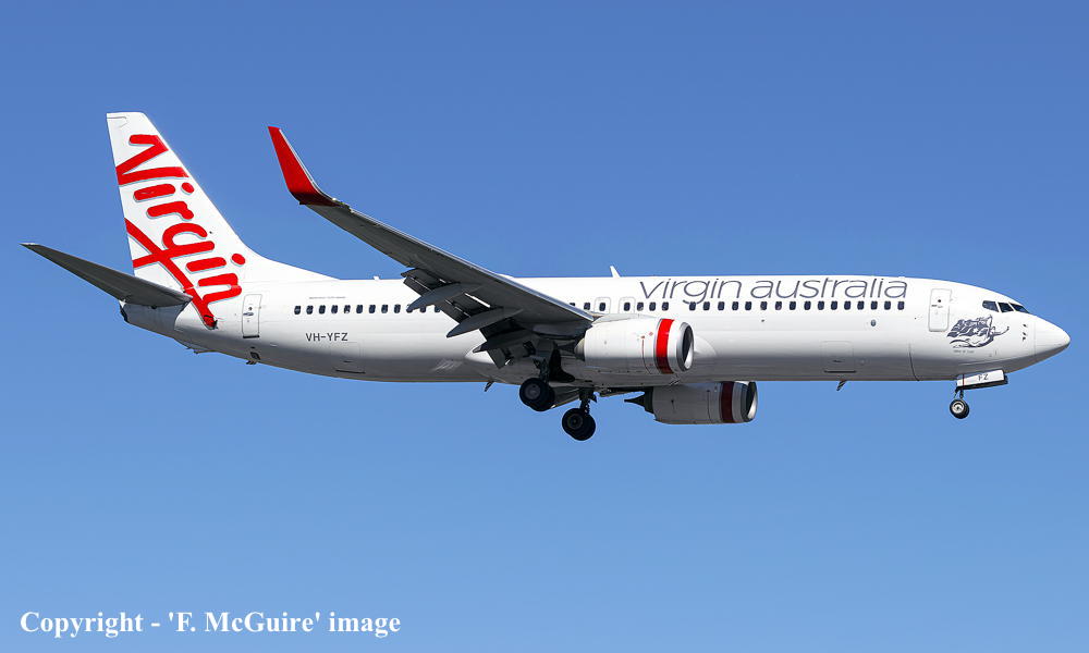 VH-YFZ. Virgin Australia - 'Lake St. Clair' in the standard livery at Sydney Kingsford Smith Airport, April 06, 2024. (F. McGuire Copyright Image 4623-361.) |