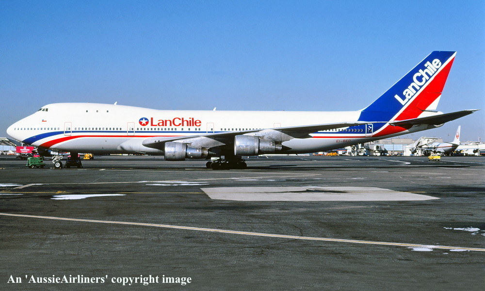 EI-BED. LanChile - in the standard livery at an unknown airport, January 1989. (R. N. Smith Collection Copyright Image 4631-044.) |