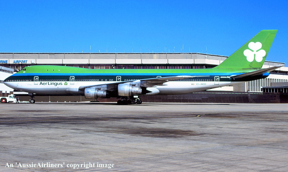 EI-BED. Aer Lingus - in the standard livery at Melbourne Tullamarine Airport, December 1987. (R. N. Smith Collection Copyright Image 4631-043.) |