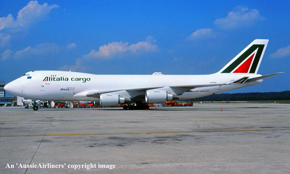 N409MC. Alitalia Cargo - in the standard livery with small 'Operated by Atlas Air' titles at an unknown airport, August 2000. (R. N. Smith Collection Copyright Image 4631-766.) |