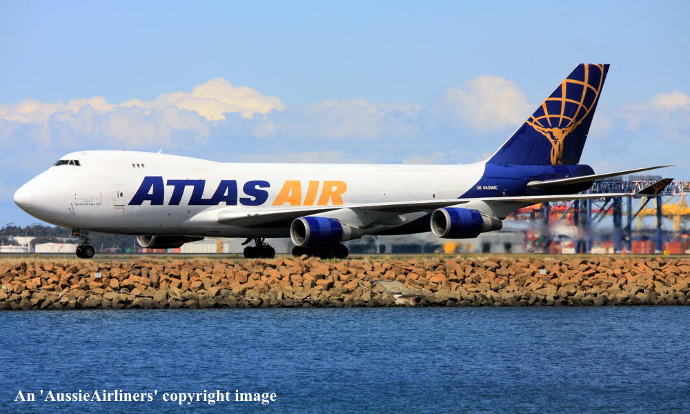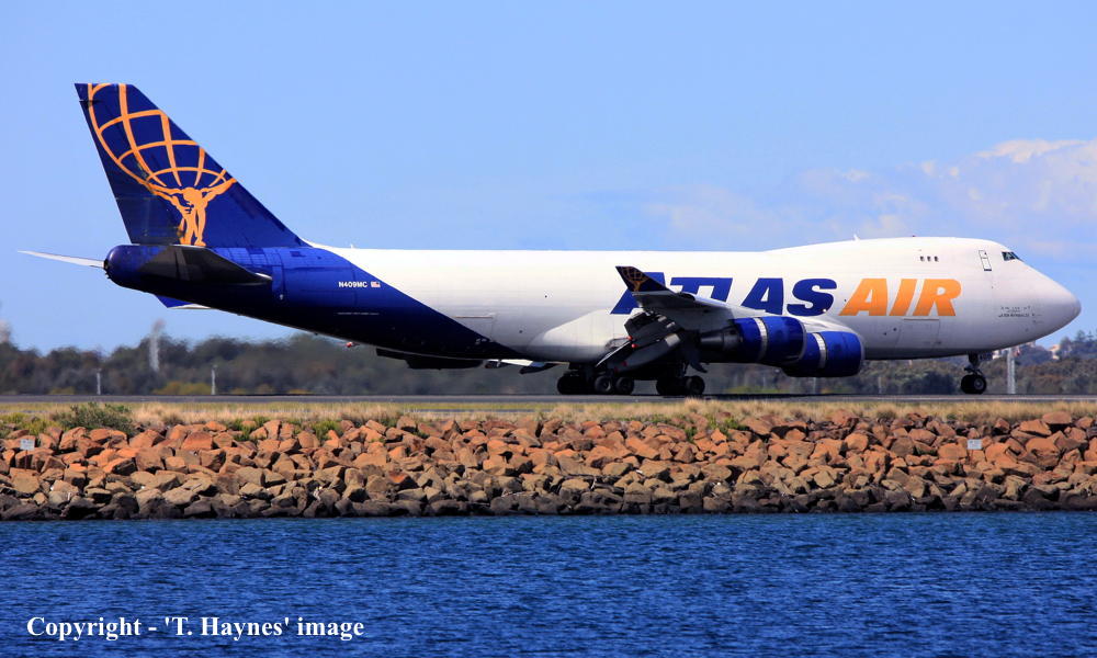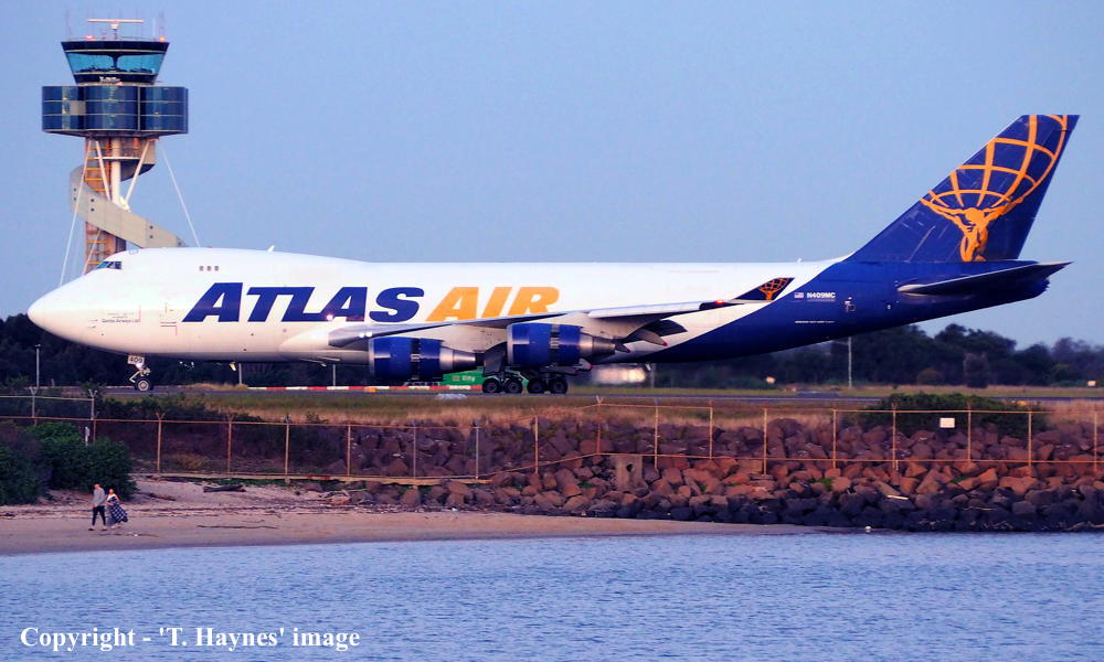 N409MC. Atlas Air - in the standard livery with small 'Operated by Atlas Air on behalf of Qantas Airways Ltd' titles at Sydney Kingsford Smith Airport, September 19, 2022. (T. Haynes Copyright Image 4631-834.) |